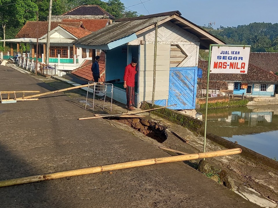 Cianjur | Ruas bahu jalan kabupaten yang berlokasi di Kampung Cinengah, Desa Sukajadi, Kecamatan Campaka, amblas pada Selasa (21/4/2021) sekitar pukul 05.00 WIB dini hari. Kejadian ini mengakibatkan dua orang terjatuh ke dalam lubang sedalam 5 meter.