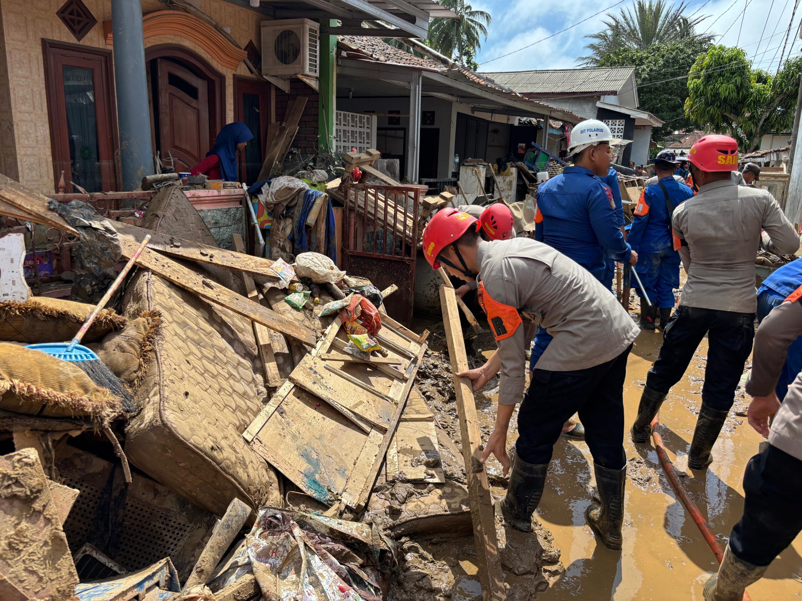 Kegiatan berlanjut pada pukul 14.29 WIB, di mana personel Satbrimob Polda Jabar bersama tim gabungan fokus melakukan pembersihan serta pengangkatan lumpur di rumah-rumah warga yang terdampak banjir bandang. Hingga saat ini, tercatat sebanyak 612 rumah warga terdampak akibat bencana tersebut.