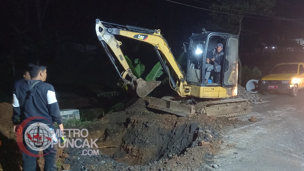 Cianjur | Satu unit eskapator berukuran sedang nampak dioperasikan seorang operator untuk memperbaikan gorong-gorong di Jl. Cikekep, Desa Cidadap, Kecamatan Campaka, Rabu malam 30/04/2025.