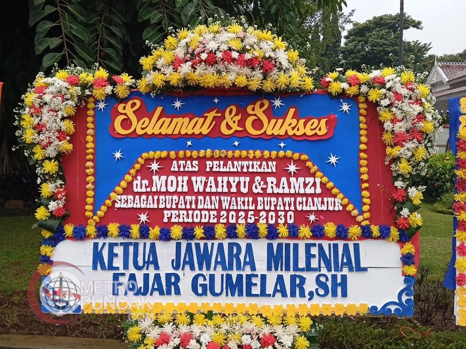 Karangan bunga ucapan selamat atas dilantiknya Bupati dan Wakil Bupati Cianjur tersebut, yang dikirim Dinas, Instansi, Lembaga, Pengusaha, Ormas, LSM ,Tim Ses, Relawan kemenangan dan elemen masyarakat lainnya memadati halaman pendopo Cianjur Jawa Barat.