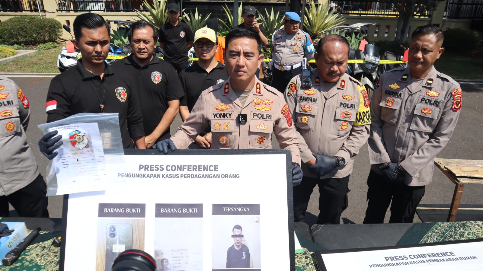Cianjur | Kapolres Cianjur AKBP Rohman Yonky Dilatha, S.I.K., M.Si. M.H., memimpin Konferensi Pers pengungkapan kasus tindak pidana perdagangan orang yang terjadi di wilayah Kabupaten Cianjur.