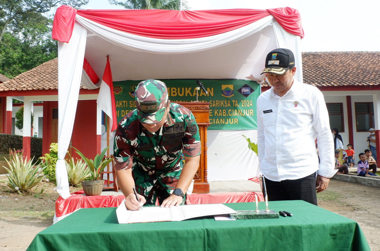 Acara dilanjutkan dengan penandatangan berita acara penerimaan pekerjaan Bakti Siliwangi Manunggal Satata Sariksa oleh Dandim 0608/Cianjur Letkol Kav Yerry Bagus Merdiyanto, S.I.P., M.Han disaksikan Asda III Setda Kab. Cianjur H.R. Dedi Sudrajat, SE., MAP yang mewakili Bupati Cianjur.