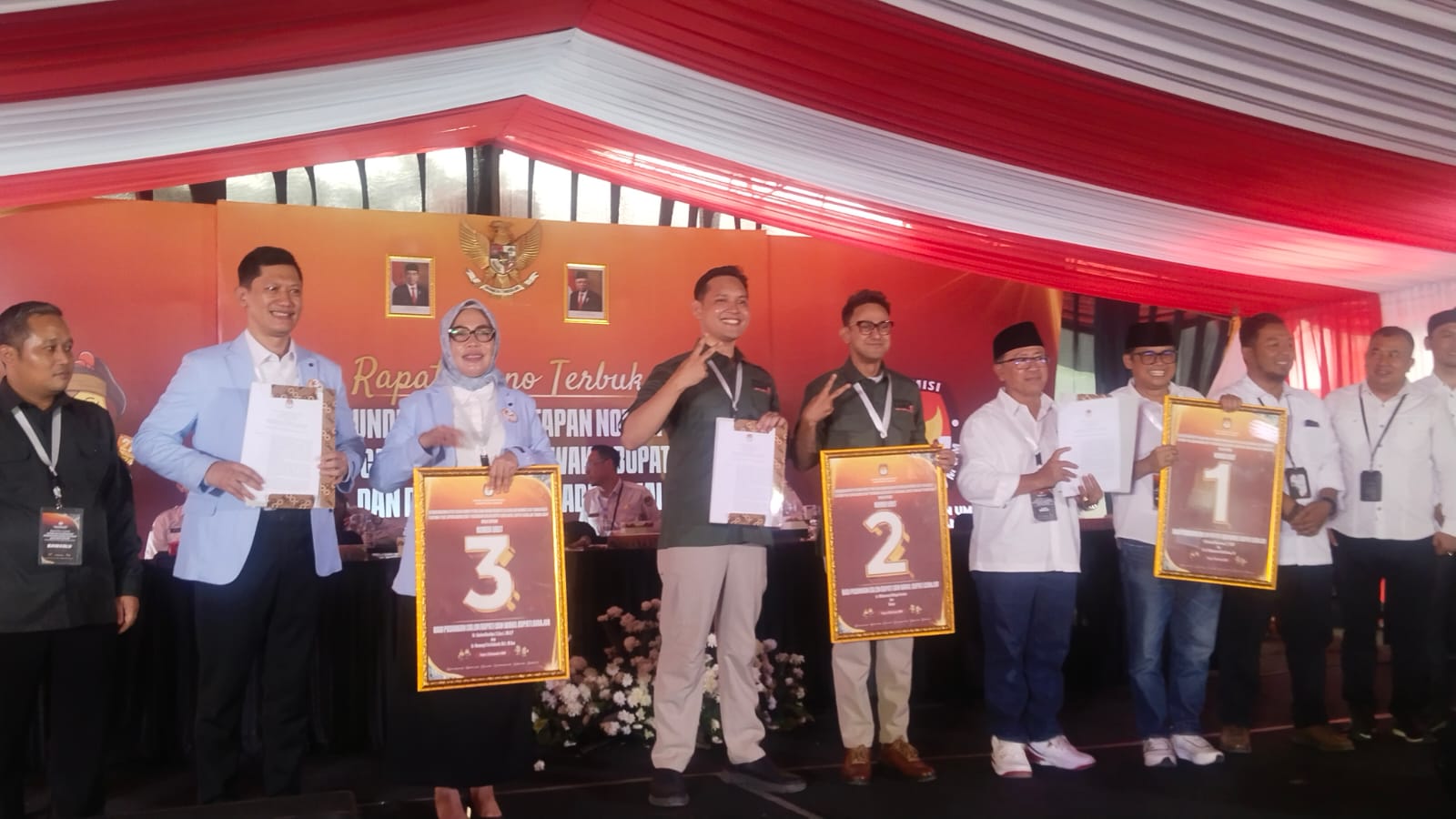 Adapun pasangan calon Bupati dan Wakil Bupati yang mengambil selongsong kotak undian yaitu pasangan dr.Muhamad Wahyu-Ferdian Ramzi mendapat No.urut 02, kemudian pasangan Herman Suherman-Muhammad Solih mendapatkan No.urut 01 dan pasangan calon Dr. Deden Nasihin-dr. Neneng Efa Fatimah mendapatkan No.Urut 03.