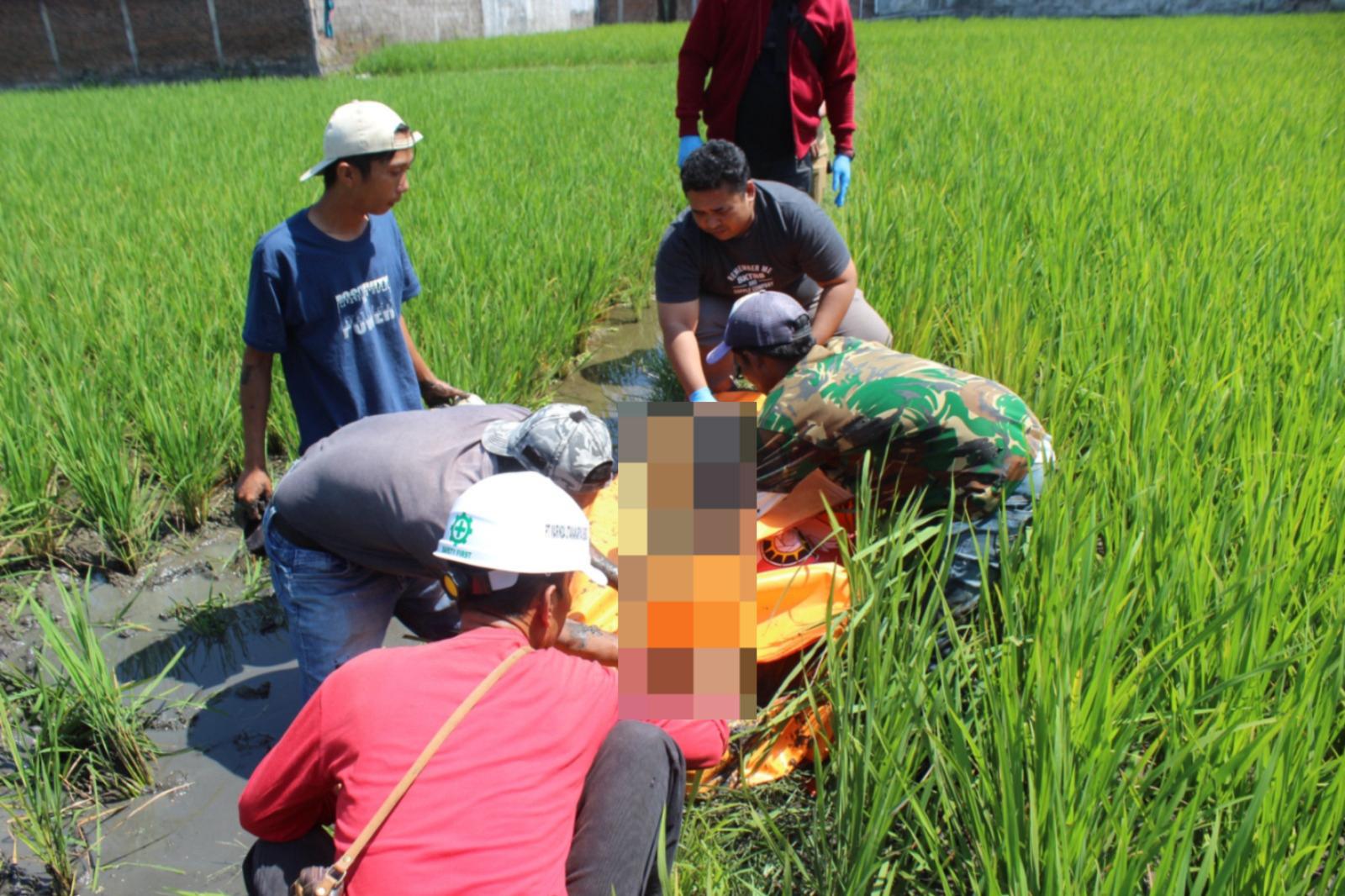 Ketua RW Setempat menerima laporan dari warga mengenai seorang pria yang tampak tergeletak di pematang sawah dalam kondisi tertelungkup. Setelah melakukan pengecekan ke lokasi pria tersebut sudah tidak bernyawa.