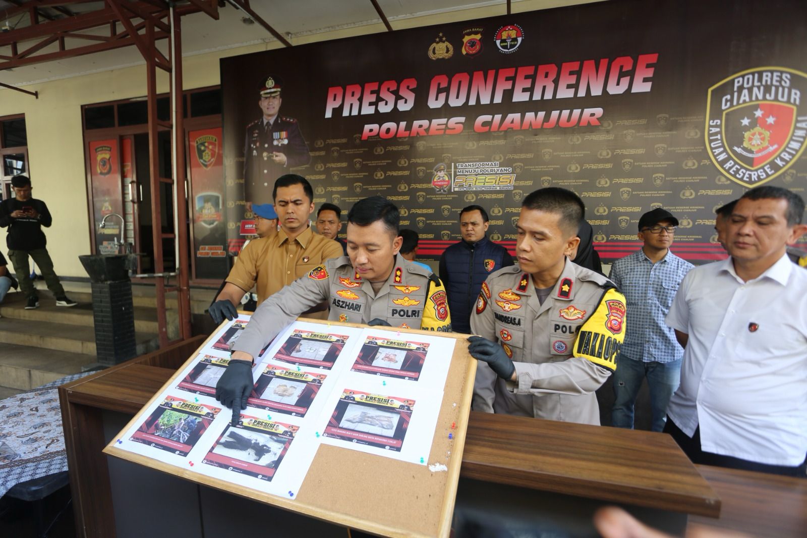 Cianjur | Polres Cianjur menggelar konferensi pers pengungkapan kasus pembunuhan dan pemerkosaan terhadap anak dibawah umur yang mengakibatkan korban meninggal dunia, konferensi pers tersebut dipimpin oleh Kapolres Cianjur AKBP Aszhari Kurniawan, S.H., S.I.K., M.Si. dan digelar di depan Gedung Sat Reskrim Polres Cianjur, Rabu (24/1/2024).
