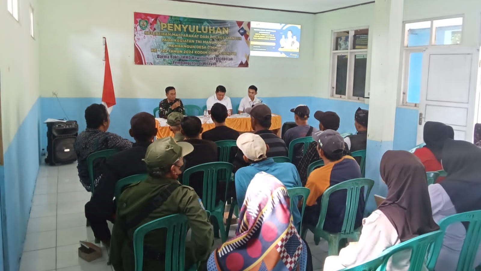 Cianjur | Satuan tugas (Satgas) TNI Manunggal Membangun Desa (TMMD) reguler ke-122 Kodim 0608/Cianjur memberikan penyuluhan wawasan kebangsaan, Hukum dan Kamtibmas serta Pertanian kepada masyarakat di Desa Ciandam, Kecamatan Mande, Kabupaten Cianjur, Rabu 9/10/2024.