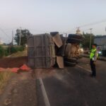 Polisi Evakuasi Truk Tronton Terguling di Kandanghaur Indramayu, Muatan Pasir Tumpah ke Jalan.